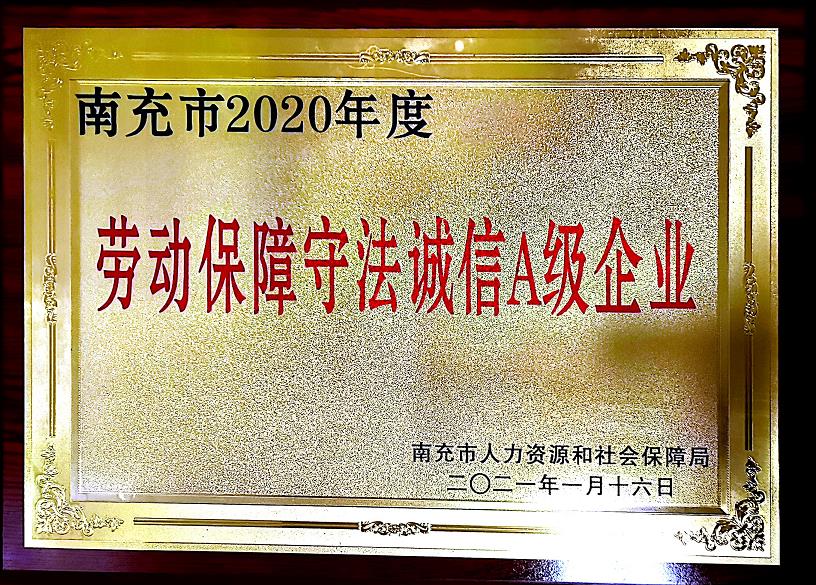 南充市2020年度勞動保障守法誠信A級企業(yè)